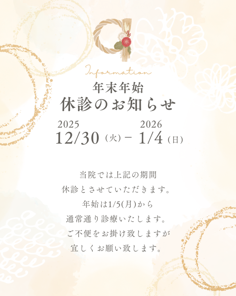 日頃より当クリニックをご愛顧いただき有難うございます。年末年始のクリニックの休業日のお知らせです。12月29日(日)から1月5日(日)までお休みとさせて頂きます。どうぞよろしくお願い致します。